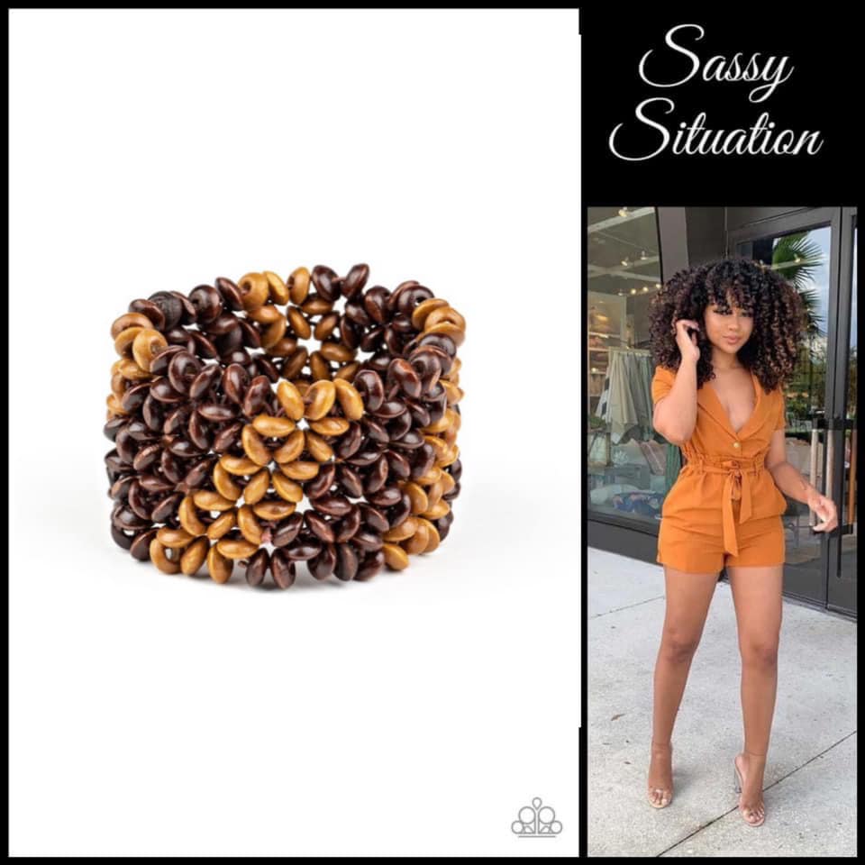 Stained in light brown and dark brown finishes, round wooden beads are threaded along stretchy bands that weave into a colorful floral patterned stretch bracelet around the wrist.