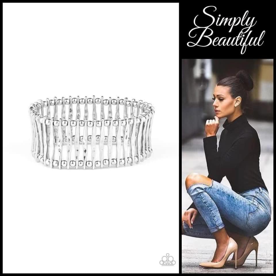 Separated by dainty silver beads, hammered silver bars are threaded along stretchy bands around the wrist for an edgy display. Sold as one individual bracelet.