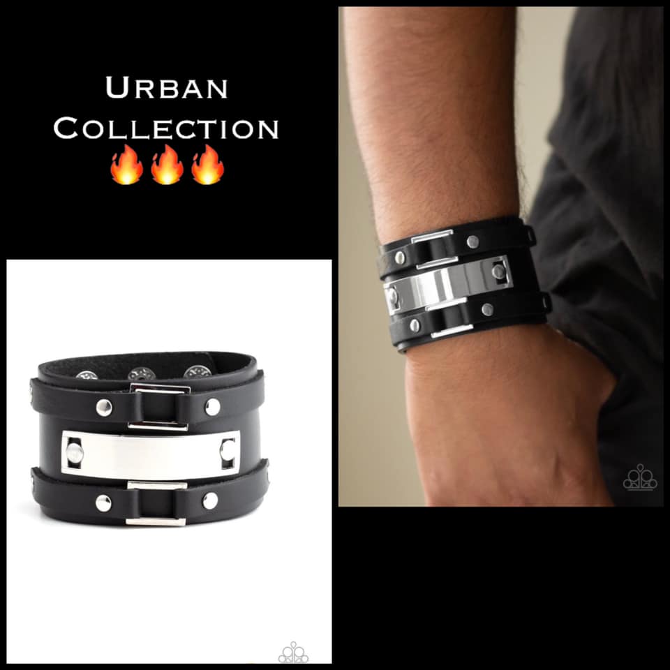 A collection of leather pieces and shiny silver frames are studded in place across the front of a thick leather band, creating an abstract buckle. Features an adjustable snap closure. Sold as one individual bracelet.