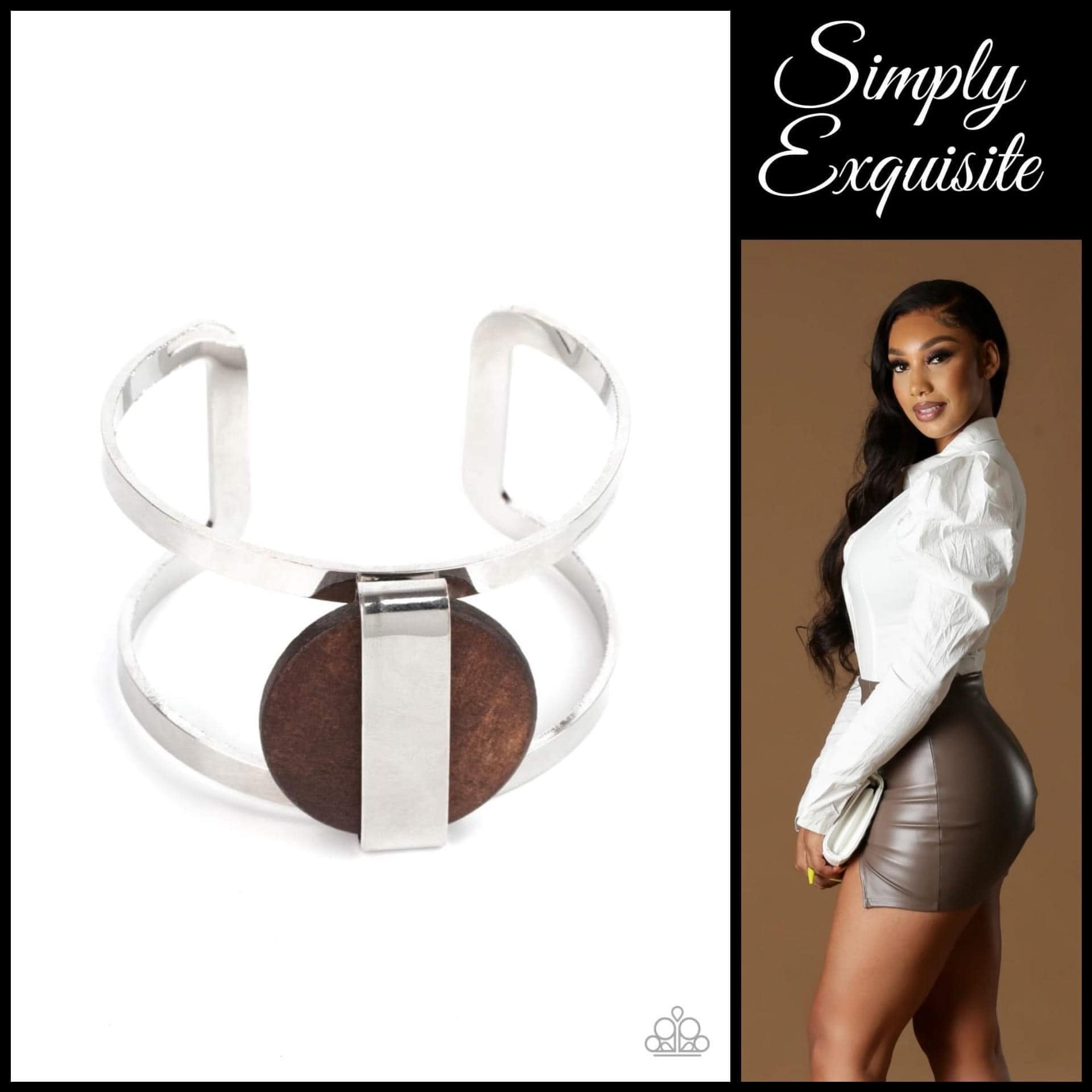 A shiny silver frame wraps around an earthy wooden disc, creating an abstract centerpiece atop a bold silver cuff for a trendy finish. Sold as one individual bracelet.